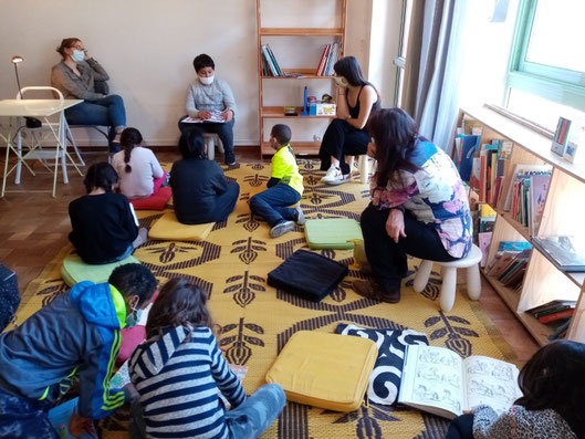 Ensuite, un temps est consacré à la lecture, ou à la présentation d’un livre, d’un texte ou d’un document. Dans l’atelier pour les adolescent·es, ce temps permet d’introduire la séance en reprenant les textes et productions de la semaine précédente ou alors en découvrant des livres et documents authentiques et se familiariser avec la recherche documentaire. Dans l’atelier pour les enfants, une animatrice peut proposer une lecture ou présenter un livre relatif à la thématique de l’atelier. Ce temps peut aussi être l’occasion pour les enfants de présenter un livre à leurs camarades et aux animatrices. Ce « club lecture » mis en place en 2021 permet de faire émerger de nouvelles formes d’échanges et expressions orales chez les enfants. Les enfants volontaires présentent un livre à tour de rôle et sous la forme qu’ils et elles désirent : lecture d’un passage, explication de son intérêt pour le livre ou encore improvisation d’une histoire racontée selon les illustrations (voir documentation associée : enregistrements “Club lecture”). On observe leur intérêt tant pour prendre la parole et présenter un ouvrage que pour l’écoute des interventions et les échanges avec les participant·es. C’est un moment où ils et elles prennent la place de l’adulte, sur le plan physique puisqu’ils et elles occupent la même place que les animatrices (sur un tabouret face aux camarades) mais aussi et surtout sur le plan de l’expression verbale puisque ce sont elles·eux qui s’adressent au groupe, dans la forme qu’ils·elles désirent, avec leurs propres mots et leurs propres procédés. Le fait d’être acteur·trice dans cette activité et de décider du livre que l’on présente au groupe renforce la place des enfants dans l’atelier et l’idée qu’ils apportent tous et toutes tout autant de richesse et de dynamisme au groupe. Les livres présentés peuvent être dans une autre langue que le français et de tout type (bande-dessinée, pièce de théâtre, ou encore livre pop-up).
