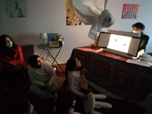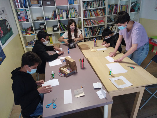 En 2020-2021, l’atelier pour les enfants a été articulé autour de la thématique des ombres et plus particulièrement autour de la production de récits individuels sur l’histoire des ombres des enfants, et la mise en scène et la transposition plastique de ces récits par la construction d’un castelet avec décors et marionnettes. Chaque enfant imagine l’histoire de son ombre qui sera le support textuel du projet artistique, puis crée le décor de l’histoire ainsi que la marionnette représentant leur ombre. Tout au long des ateliers, le texte a pu être repris et modifié par les enfants avec l’aide, si besoin, d’une animatrice. Ce projet permet d’aborder la question interculturelle et l’expérience des enfants allophones en situation de migration par une pédagogie du détour autour de la métaphore du double et de la dualité, le tout dans une démarche artistique et expérimentale.
