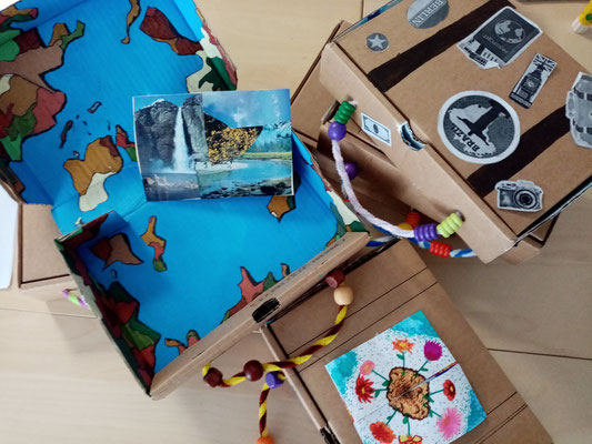 En 2020-2021, l’atelier pour les adolescent·es aborde la thématique du voyage. Les participant·es construisent une valise dans laquelle ils et elles sont amené·es à créer divers supports à histoires et récits de voyages (carte postale, leporello, mini-livre, etc…). Chaque texte écrit est imaginé et rédigé par son auteur·e puis repris et éventuellement corrigé par l’animatrice qui retranscrit le texte en 3 versions : la version originale, la version originale où les erreurs d’orthographe et de syntaxe sont corrigées, et une version où certains éléments du texte peuvent être réorganisés pour plus de fluidité et de cohérence dans la lecture. Les participant·es ont toujours la possibilité de choisir quelle version leur convient (voir documentation associée: trame de correction en trois temps).