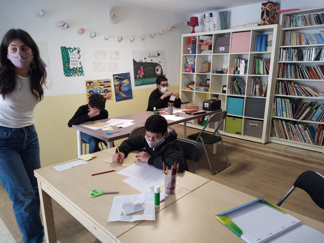 En 2020-2021, Donalie-An Mugnier, animatrice interculturelle et français langue étrangère à la Boutique d’écriture co-anime l’atelier du mardi à destination de enfants avec Lucie Naudé, volontaire service civique ainsi que deux bénévoles de la Boutique d’écriture, Claire et Marie (voir documentation associée: entretiens avec les bénévoles). Le groupe du mardi est composé d’une douzaine d’enfants scolarisé∙es à Montpellier, du CM1 à la 6ème. L’atelier du mercredi est animé par Perrine Rieux, animatrice interculturelle, ainsi que Pauline Vial, volontaire service civique. Le groupe du mercredi accueille cette année cinq adolescents collégiens. Certain·es enfants et adolescent·es sont scolarisé·es en UPE2A (Unité Pédagogique pour Elèves Allophones Arrivants) en parallèle de la classe ordinaire. Le niveau de français est hétérogène au sein des groupes.